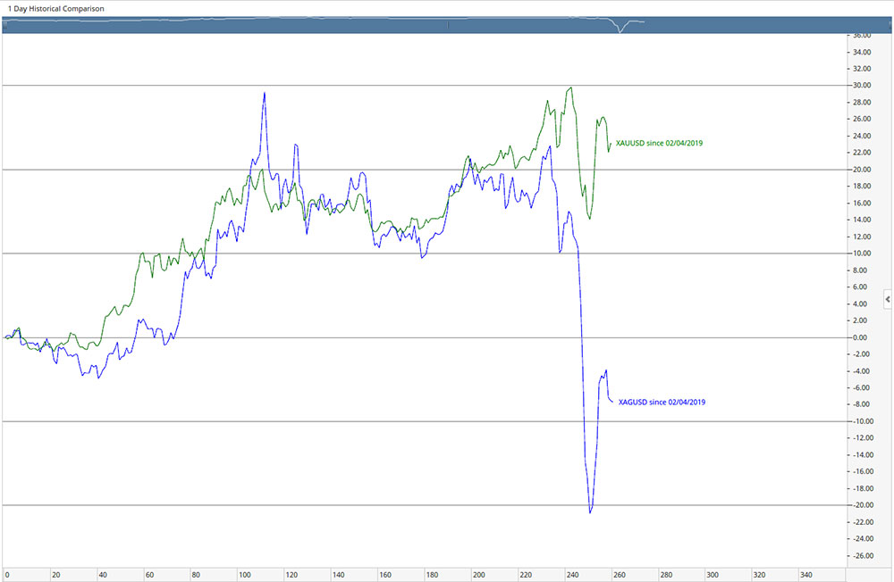 Auch das Gold gab nach einem zwischenzeitlichen Höchststand nach, ebenso das Silber. Beim Gold ist zu vermuten, dass nebst dem Verlangen nach Bargeld auch Anlagen mit involviertem Fremdkapital (Hebel oder leverage) verkauft werden mussten. Beim Silber kam zusätzlich der Umstand einer reduzierten Industrie-Aktivität dazu.