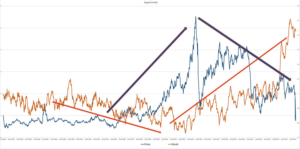Als wäre die Corona-Krise noch nicht genug, kam noch der Disput zwischen Saudi Arabien und Russland bezüglich Ölfördermenge bzw. Ölpreis dazu. Die Folgen waren ein Angebotsschock im Sinne einer hochgefahrenen Kapazität bzw. Fördermenge, was auf den Preis drückte. Mit der Ausgangssperre und dem Herunterfahren der Wirtschaft bei der Bekämpfung des Virus erfährt auch die Nachfrage zusätzlich einen noch nie dagewesenen Dämpfer: Wir hören, dass die globale Öl-Nachfrage um bis zu 1/3 eingebrochen ist. Die Lager für strategische Reserven sind in diese Bresche gesprungen und haben aufgestockt. Diesbezüglich ist interessant zu sehen, dass eine negative Korrelation zwischen dem Ölpreis und der Lagerbildung existiert. Dies, wie unten dargestellt, im längerfristigen Horizont, aber auch im kurzfristigen Zeitfenster. Zusätzlich ist zu erwarten, dass die USA bei den Saudis Druck machen, den Preis zu stabilisieren (ist schon mal geschehen in der Geschichte, als Präsident Reagan zusammen mit den Saudis die Sowjetunion mit tieferen Ölpreisen unter Druck brachte – diesmal jedoch braucht die USA höhere Preise). Die US-Ölindustrie im Bereich des „fracking“ wird bei Preisen unter USD 40 pro Fass WTI grosse Probleme haben und eine grosse Zahl von Konkursen ist unvermeidlich. Die Saudis selbst können günstig Öl fördern, benötigen aber mit einen geschätzten Ertrag von USD 60 pro Fass um den Staatsapparat am Laufen zu halten und wahrscheinlich eher Richtung USD 80 pro Fass um Defizit-neutral zu sein. Einziger Profiteur könnte Russland sein, welcher – vom US-Dollar losgelöst – relativ autark unterwegs ist und mit grossen Goldbeständen von einer dahin serbelnden westlichen Wirtschaft eher auf der langen Linie zu profitieren gedenkt. Unter dem Strich ist zu erwarten, dass die aktuellen Verwerfungen auch geopolitisch zusätzlich einiges in Bewegung bringen. Der Ölpreis dürfte bis auf weiteres – bis die Wirtschaft wieder hochgefahren wird – unter Druck bleiben.