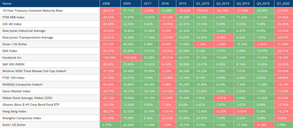 Das erste Quartal war geprägt durch das eine Thema: Die Covid-19 oder die Corona-Krise. Das Jahr jedoch begann freundlich und die Märkte setzten den Weg fort, hin zu noch teureren Bewertungen. Wie im Q4 2019 Navigator beschrieben, hat sich das Gewinnwachstum gegenüber dem Anstieg der Bewertung verlangsamt, sprich, für eine Einheit Rendite musste zunehmend mehr bezahlt werden. Vom Virus wussten wir alle schon länger, aber erst ab Mitte Februar kam es zu ersten, noch relativ zahmen, Abgaben. Schon fast aus dem Nichts kam danach der Schlag des Börsenbären. Mit dem Näherkommen und ansteigenden Kurven von Angesteckten reagierten die Märkte panisch. Die von den Behörden verordnete Schließung von Betrieben gab der ganzen Misere eine neue Dimension. Doch nicht nur das Corona Virus sondern auch die relativ teuren Märkte wie auch die Marktstruktur nach der Finanzkrise 2008/09 haben mit ausgedünnter Liquidität zu dieser heftigen Korrektur beigetragen. Zwar werden hohe Volumen gehandelt, aber die Liquidität ist über die letzten Jahre durch eine neue Struktur der Märkte zunehmend ausgedünnt worden: Immer mehr Kapital wird über Strukturen wie ETFs verwaltet und in abnehmender Form gibt es die grossen Eigenhandelsbücher bei Banken, welche antizyklisch eingreifen können, nämlich dann, wenn die Endkunden die Nerven verlieren und verkaufen.