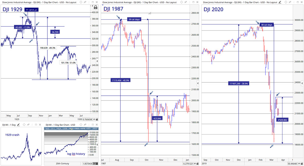 Ökonomen vergleichen die Situation von heute gerne mit dem Crash von 1929 oder – weniger schlagzeilenträchtig – mit der Korrektur von 1987. 1987 kommt dem Verlauf der aktuellen Kurskorrektur am nächsten, bezüglich Dauer und Verlustumfang. Die Erholung unmittelbar nach der Korrektur war auch 1987 um die 40% (gemessen vom vorherigen Höchststand zum Tiefpunkt der Bewegung). 1929 dauerte der erste Einbruch mit rund 40% Erholung ebenfalls um die 1.5 Monate. Und hier stehen wir jetzt so gesehen, 1987 startete danach ein weiterer Aufwärtstrend, 1929 sollte Schlimmeres erst noch kommen.
