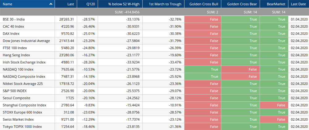 Die Verluste gemessen vom Beginn des Monats März zu den Tiefs (troughs) markieren den vorläufigen Höhepunkt der Panikverkäufe (um Mitte März). Die meisten Märkte befinden sich zwischenzeitlich bereits in einem Bärenmarkt.