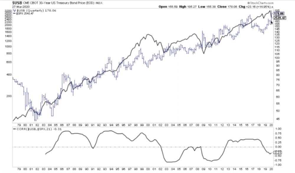 Nebst den noch tieferen Zinsen kommt neu die Variante Fiskalstimulus vermehrt zum Einsatz, was zusätzlich Geld in die Märkte flutet. Aufgrund der Korrelation zwischen den Zinsen und der Bewertung von Aktien könnte von dieser Seite her weiter Unterstützung für die Märkte kommen. Zwar sind die Zinsen nahe oder bei null und es stellt sich irgendwo die Frage, wie lange das andauern kann. Wenn der Staat nun zusätzlich MMT/Fiskalpolitik macht, könnte das zusätzliche Geld die Märkte nochmals stimulieren.