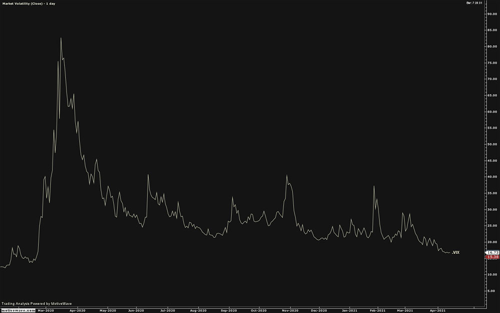 Der Volatilitätsindex ist inzwischen getreu der Marktstimmung auf tiefe Niveaus zurückgekehrt, wobei hier noch Potential auch nach unten möglich ist, sollte dank der unglaublichen Geldmengen eine gewisse Unbekümmertheit wieder dominieren.
