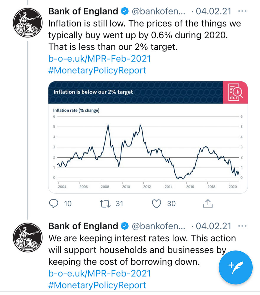 Die Zentralbanken haben signalisiert die Leitzinsen auf absehbare Zeit tief zu halten. Selbst ein Überschiessen über die Inflationszielgrösse (2%) würde noch kein Eingreifen nach sich ziehen – denn man wünscht eine nachhaltig höhere Inflation, weg von der Nullschwelle. So lautet die Definition neu: Die Inflation soll im Durchschnitt im Bereich der Zielgrösse liegen, wodurch auch Messungen von über 2% toleriert werden können (unten eine Nachricht der Bank of England – die EZB und die US-Fed teilen diese Ansicht).
