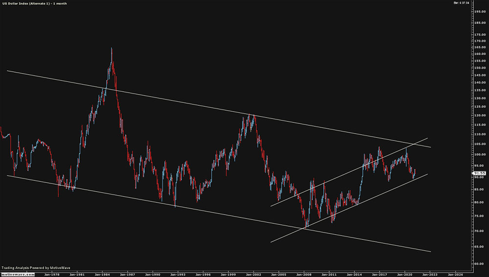 Der US-Dollar steht gewissermassen vor einer ähnlichen Frage, ob sich der langfristige Abwärtstrend fortsetzt oder ob wir eine Trendwende gesehen haben (auch im Index gegenüber den handelsgewichteten Währungen). Seit der Finanzkrise 2008/09 konnte sich der US-Dollar vom unmittelbaren Abwärtstrend lösen und befindet sich nun am oberen Ende des übergeordneten Trends.
