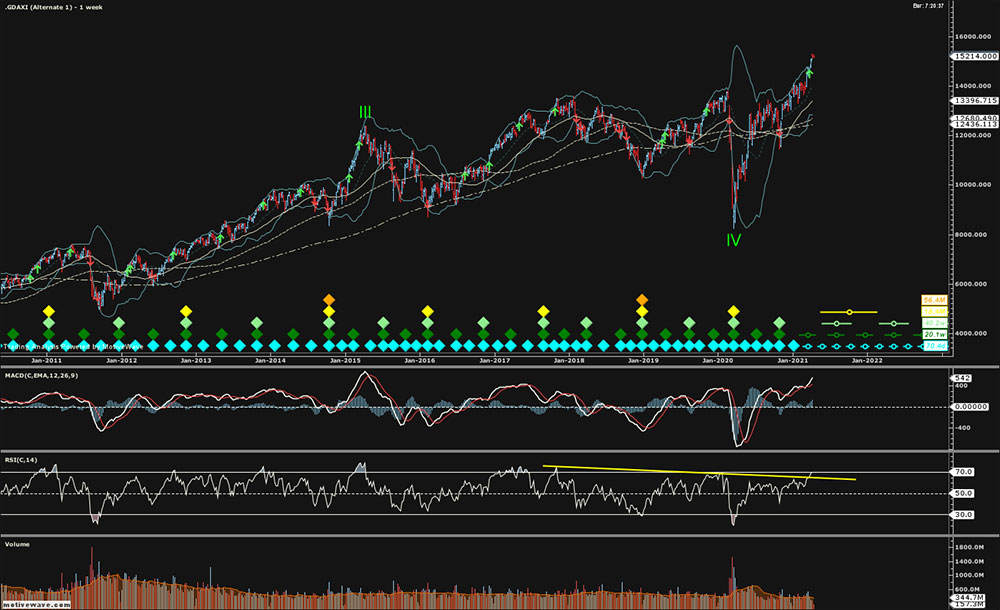 Der Deutsche Aktienindex DAX zeigt im Wochenchart einen Ausbruch nach oben, wenn auch bereits im leicht überkauften Bereich.