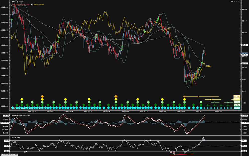 Anbei ein Chart, welcher die Rendite der 10-jährigen US-Staatsanleihe im Vergleich mit dem Goldpreis in USD (invers) darstellt. Interessant zu sehen sein wird, ob die Zinsen weiter ansteigen werden oder ob diese zurückfallen in den alten Trend.