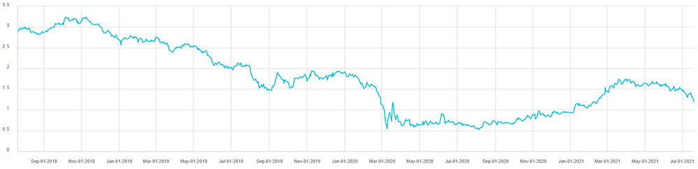 Die Rendite der 10-jährigen US-Treasury hat sich vorerst wieder etwas gesenkt, nachdem im ersten Quartal ein frappanter Anstieg zu verzeichnen war. Ob die Märkte die Ansicht der Zentralbanken teilen, nämlich, dass die Inflation nur von vorübergehender Natur ist, und/oder, dass die Anleihen einfach an Wert zulegen, weil die Banken das Geld nicht ausleihen können und somit dieses in Festverzinsliche investieren?