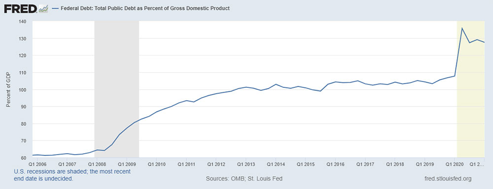 Die durch die Regierungen verordneten Lockdowns mit den dazugehörenden Lasten trugen weiter zum wachsenden Schuldenbetrag bei: Gemessen am Bruttosozialprodukt ist die Schuldenlast der immer noch grössten Volkswirtschaft der Welt, der USA, merklich über die 100%-Marke hinausgetreten und hat mit über 130% weit über der Marke von 106% nach dem zweiten Weltkrieg eine neue beachtenswerte Marke gesetzt.