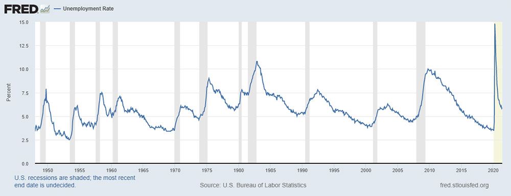 Mit dem Wiederöffnen der Wirtschaft sind auch die Arbeitslosenzahlen rasant zurückgekommen. Mit der aktuellen Gangart könnten die Arbeitslosenzahlen bereits Ende 2022 wieder auf dem Niveau von vor der ausgerufenen Pandemie landen. Dies wäre eine Erholung, welche sich ca. fünf Mal schneller abspielt als damals bei der Finanzkrise.