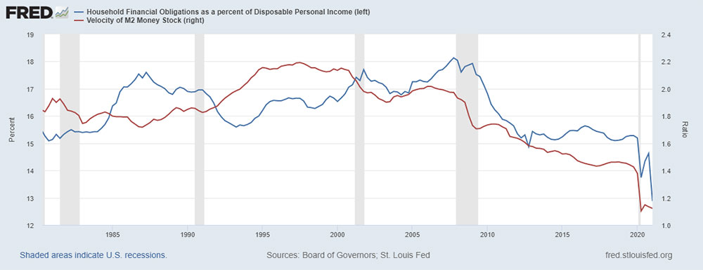 Die Abbildung zeigt z.B. den Zusammenhang zwischen der Verschuldung der Privathaushalte und der Umlaufgeschwindigkeit des Geldes (Geldmenge M2: Bargeldumlauf und Buchgeld-Sichtguthaben).