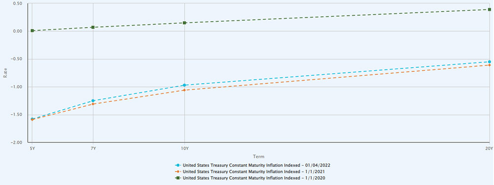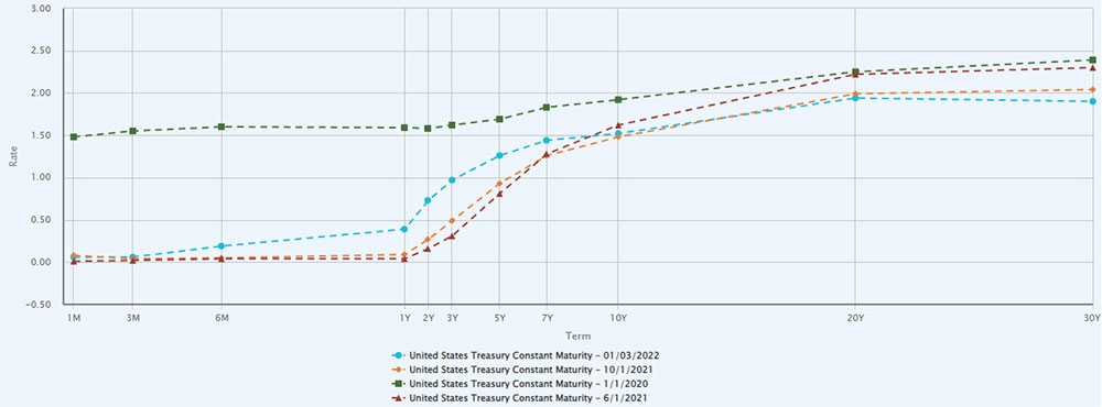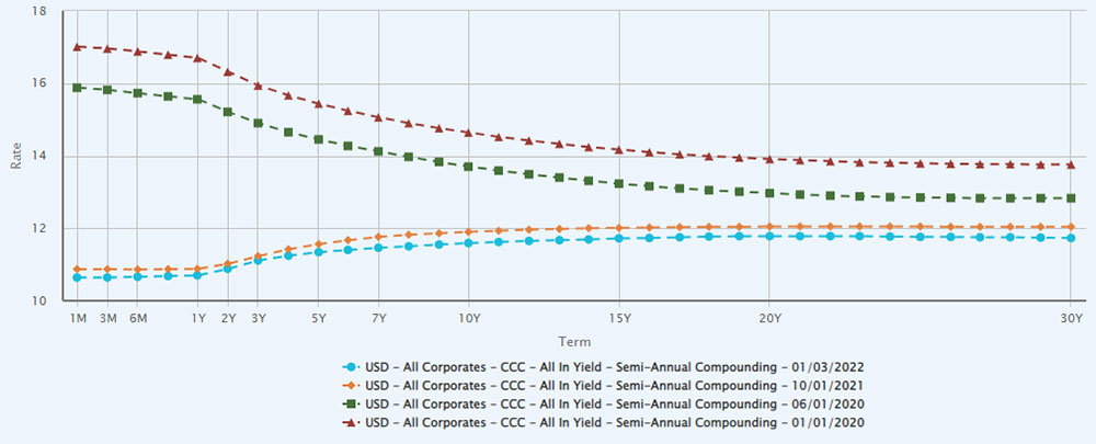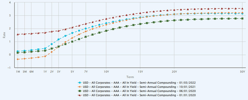 Bei den Firmenanleihen sieht man eine gewisse Entspannung, wo die Renditen für schlechtere Schuldner leicht gesunken sind. Gegenüber der Zeit von vor der Pandemie ist die Kurve auch nicht mehr invers für diesen Sektor und generell gesehen für das letzte Quartal im Jahr 2021 in der Tendenz steiler geworden.