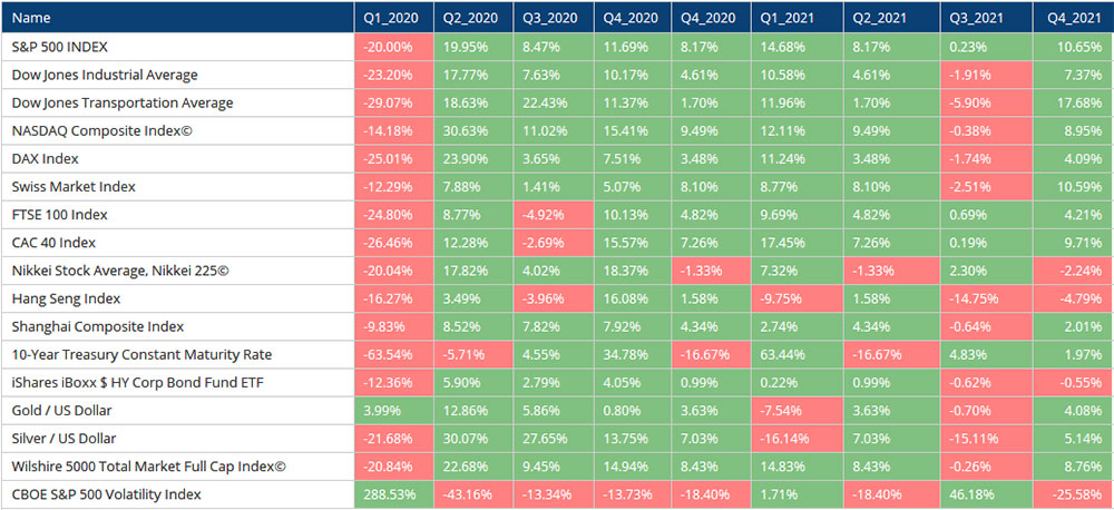 Die Märkte konnten im vierten Quartal unter dem Strich ein freundliches Bild hinterlassen. Zwischenzeitlich sah dies anders aus: Im November schwankte das Sentiment und die Anleger zeigten sich risikoavers. Seither bewegen sich die Märkte in einer Seitwärtsbewegung, wo gegen Jahresende hin zum Teil ein Ausbruch nach oben zustande gekommen ist. Die defensiveren Titel konnten dabei etwas an Terrain gegenüber den zyklischen Werten – zum Teil auch gegenüber den Wachstumstiteln, wobei hier gegen Jahresende hin eine starke Erholung eingesetzt hat, vornehmlich bei den US-Tech-Titeln. Die asiatischen Märkte standen etwas mehr unter Druck und schlossen zum Teil noch leicht im Minus. Die Volatilität brach analog zur angespannten Situation im November zu Höchstwerten auf, wie wir sie zuletzt im März 2020 gesehen haben, senkte sich dann aber wieder auf behutsamere Pegel von unter 20 per Jahresende (gemessen am US-amerikanischen S&P500 Index).