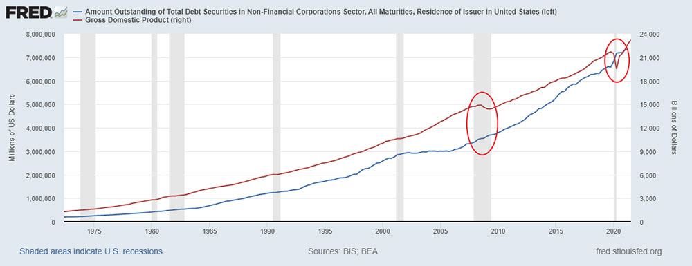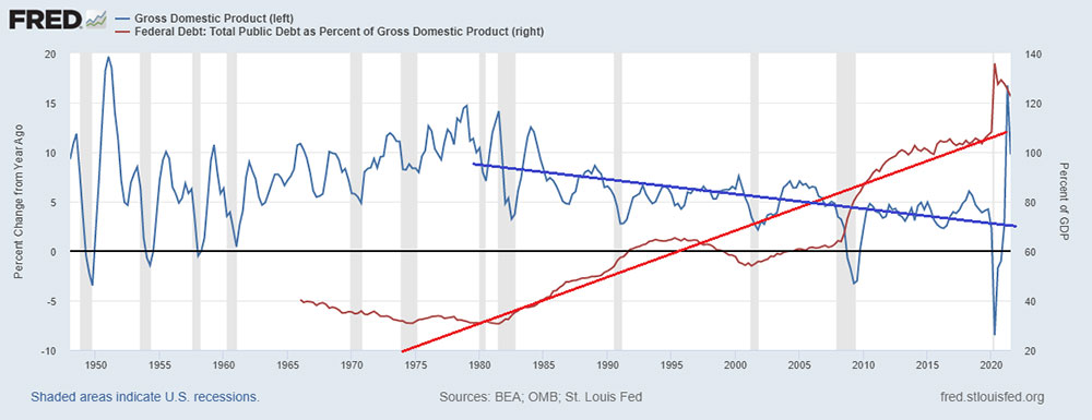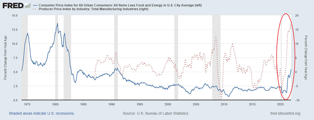 Mit der Pandemie, den Lockdowns und weiteren Massnahmen wie Quarantänen ist die Wirtschaftsleistung beschnitten worden. Die gleichen Politiker haben jedoch, bei weniger Produktion, Ausfälle bei den Einkommen möglichst aufzufangen und mit Zutun von Stimuluspaketen Geld auszubezahlen.