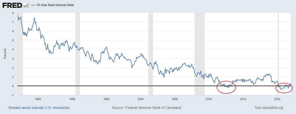 Generell kann gesagt werden, dass die Kapitalmärkte widersprüchlich zur allgemeinen Wahrnehmung keine nachhaltige Inflation sehen. Die Inflations-adjustierten Renditen zeigen eine nur minimale Erhöhung gegenüber von vor einem Jahr, jedoch eine merklich tiefere Rendite gegenüber von vor zwei Jahren.