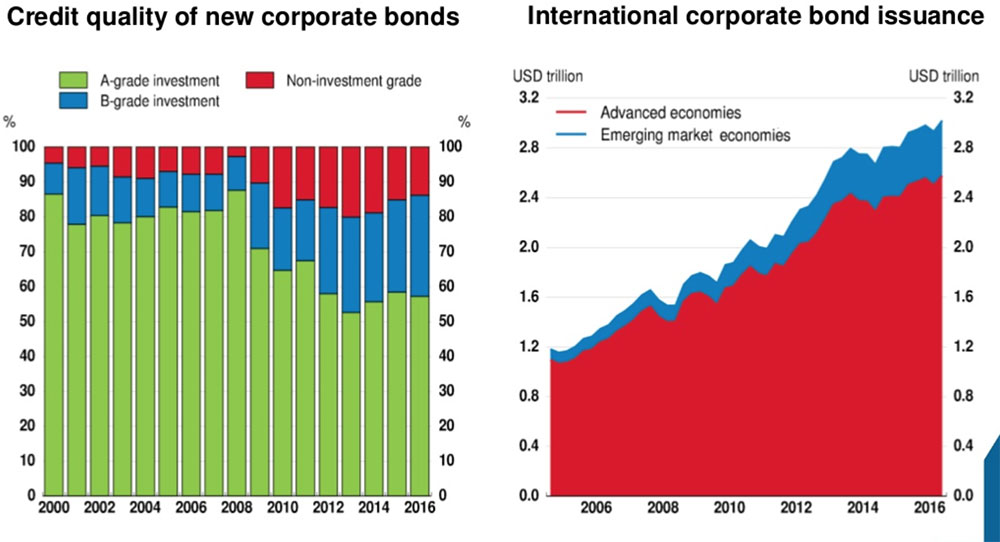 Ein weiterer bemerkenswerter Umstand ist die Notenbank-Aktivität der letzten Jahre. Das massive Eingreifen der Zentralbanken in den Preisfindungsprozess hat zur Folge, dass die Zinskurve die gewohnten Marktkräfte nicht mehr unisono widerspiegelt (die EZB z.B. hält Anleihen im Wert von mehr als 2 Billionen Euro, was mehr ist als die gesamte deutsche Staatsverschuldung, der grössten Volkswirtschaft Europas). Neue Regulierung hat zudem gewissen Marktteilnehmern wie der Versicherungsbranche auferlegt, Anleihen zu kaufen, auch wenn diese keine Einkünfte bringen (Staatsanleihen, welche als risikolos klassifiziert sind). In Anbetracht von stets ansteigenden Schulden der öffentlichen Hand könnte man auch von finanzieller Repression sprechen. Der private Sektor hat sich ebenfalls zusätzlich verschuldet, bei den börsenkotierten Unternehmen wurden zudem aufgenommene Gelder für den Rückkauf von Aktien verwendet. Die Schuldnerqualität hat sich über die letzten Monate verschlechtert.