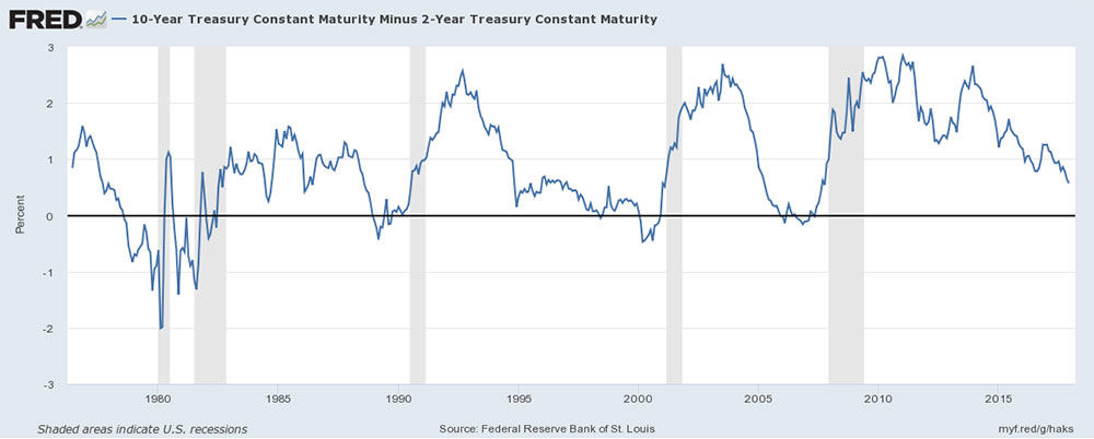 In der Vergangenheit hat eine Verflachung der Zinskurve (2-jährige Rendite gegenüber der 10-jährigen Rendite) mit einem gewissen zeitlichen Verzögerung aber guter Zuverlässigkeit zu Korrekturen an den Aktienmärkten geführt.