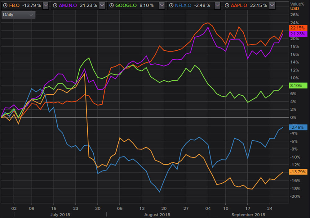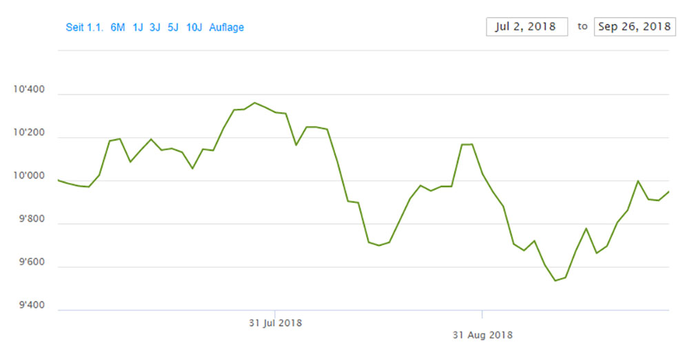 Ein weiteres Unternehmen, Tesla, machte ebenfalls von sich Reden als der Geschäftsführer und Mitinhaber (19.7%) Elon Musk am 7. August via Twitter verkündete, er überlege sich, die Firma von der Börse zu nehmen. Der Titel war übers Quartal sehr schwankungsfreudig. Am 7. August kam dieser seinem Allzeithoch vom September 2017 nah, um am 7. September rund 30% tiefer, wiederum nah beim diesjährigen Tief vom April, sich wiederzufinden. Netflix ist ein weiterer bekannter Tech-Titel, welcher etwas Federn hat lassen müssen und jetzt wieder Hoffnung zur Wiederaufnahme von (fast) alter Stärke vermittelt.