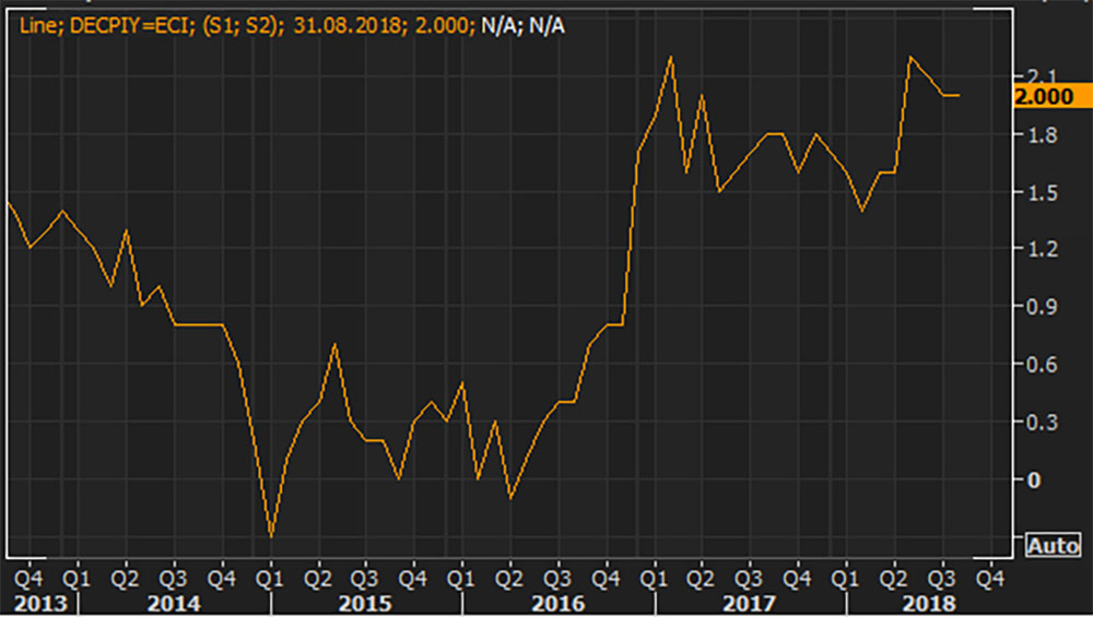 In den USA hat die Inflation seit 2015 Fahrt aufgenommen und dies im vergangen Quartal, wenn auch etwas flacher, fortgesetzt.