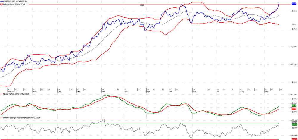 Die Rendite der 10 jährigen US-Staatsanleihen hat gegen Ende des Quartals einen frischen Anlauf genommen, um die 3% Hürde hinter sich zu lassen (bei rund 3.1% als Widerstand). Die Würfel sind diesbezüglich noch nicht gefallen. Schenkt man den Kapitalmärkten Glauben, dann dürften die Zinsen nicht in großem Ausmass weiter ansteigen. Technisch gesehen würde jedoch die Schwelle um 3.3% eine mögliche Positionsbereinigung herbeiführen können.