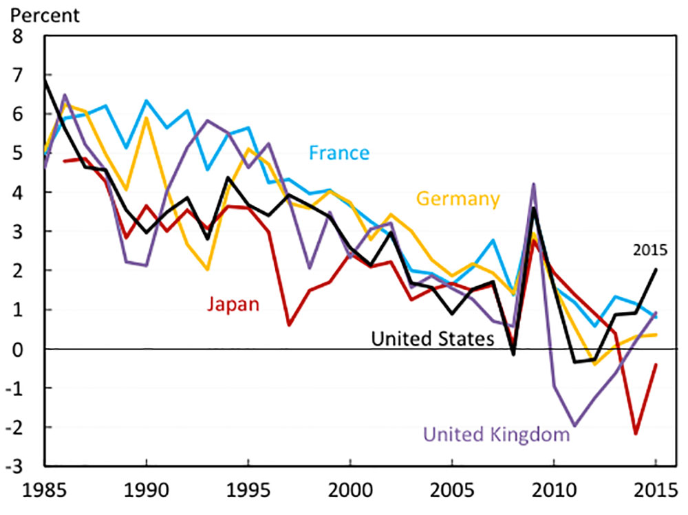 In 2000, David Reifschneider and John Williams estimated that the zero lower bound would be constraining about 5% of the time in the US, with a mean duration of four quarters. However, the international experience since the Great Recession suggests that, if anything, this estimate was overoptimistic. A key assumption in this analysis was an equilibrium real federal funds rate of 2.5%, well above recent projections from the Federal Open Market Committee, whose estimates range from 0.5% to 1.8%. Consequently, the effective lower bound will likely constrain conventional monetary policy more than 5% of the time in the future (Dordal-i-Carreras et al. 2016).2 And while unconventional monetary policy can still operate, there is substantial controversy over its efficacy and side effects.