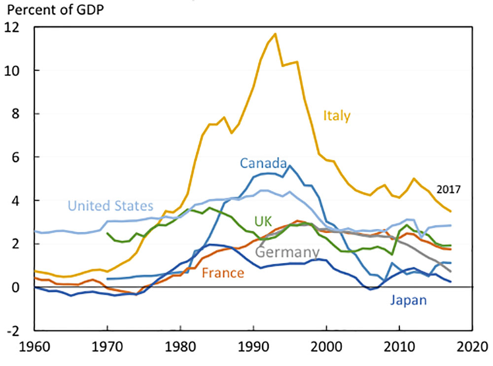 Even to the degree that stimulus adds to the debt, ideas of optimal debt levels need to consider reduced future liabilities and persistently lower interest rates. For example, nearly three-quarters of advanced economies have smaller expected increases in pension and health spending between 2010 and 2030, comparing latest IMF projections to those five years ago (IMF 2011, 2016b). Moreover, permanently lowered interest rates increase the threshold of sustainable government debt. (Elmendorf and Sheiner 2016).4 Indeed, major advanced economies today have relatively low interest payments as a share of GDP, as shown in Figure 3.