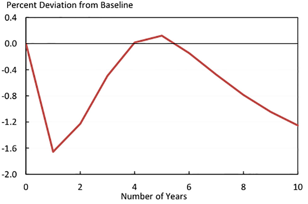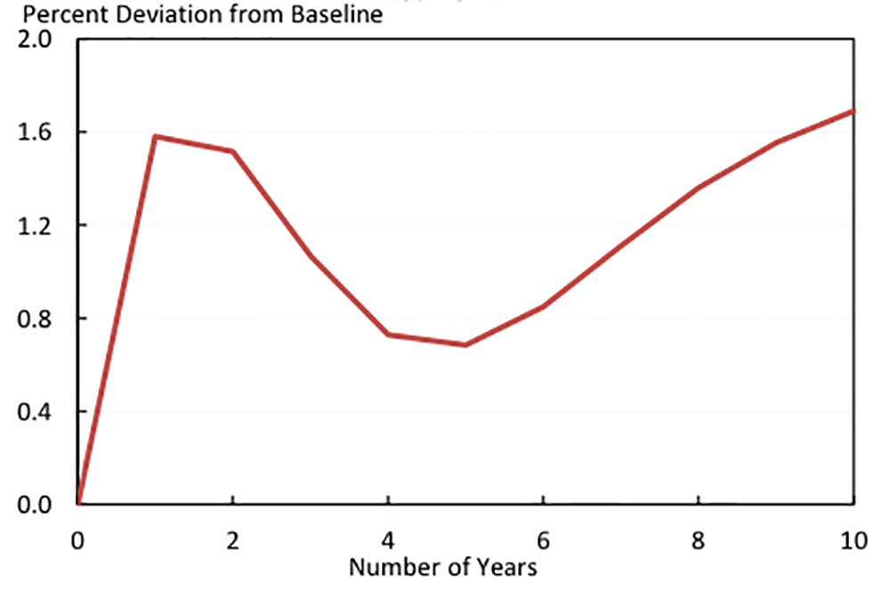Investments in innovation may have higher long-run payoffs, with the IMF finding that an expansion of research and development (R&D) with an annual fiscal cost of 0.4% of GDP can raise the long-run output level by 5% in advanced economies (IMF 2016a).